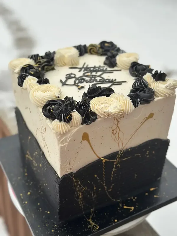 Our square cake is 4 layers and serves approximately 38-40 guest when sliced into standard party portions (1.5"x2"). For more petite, event style servings - like those seen at weddings (1"x2")- you can expect about 48-56 slices.