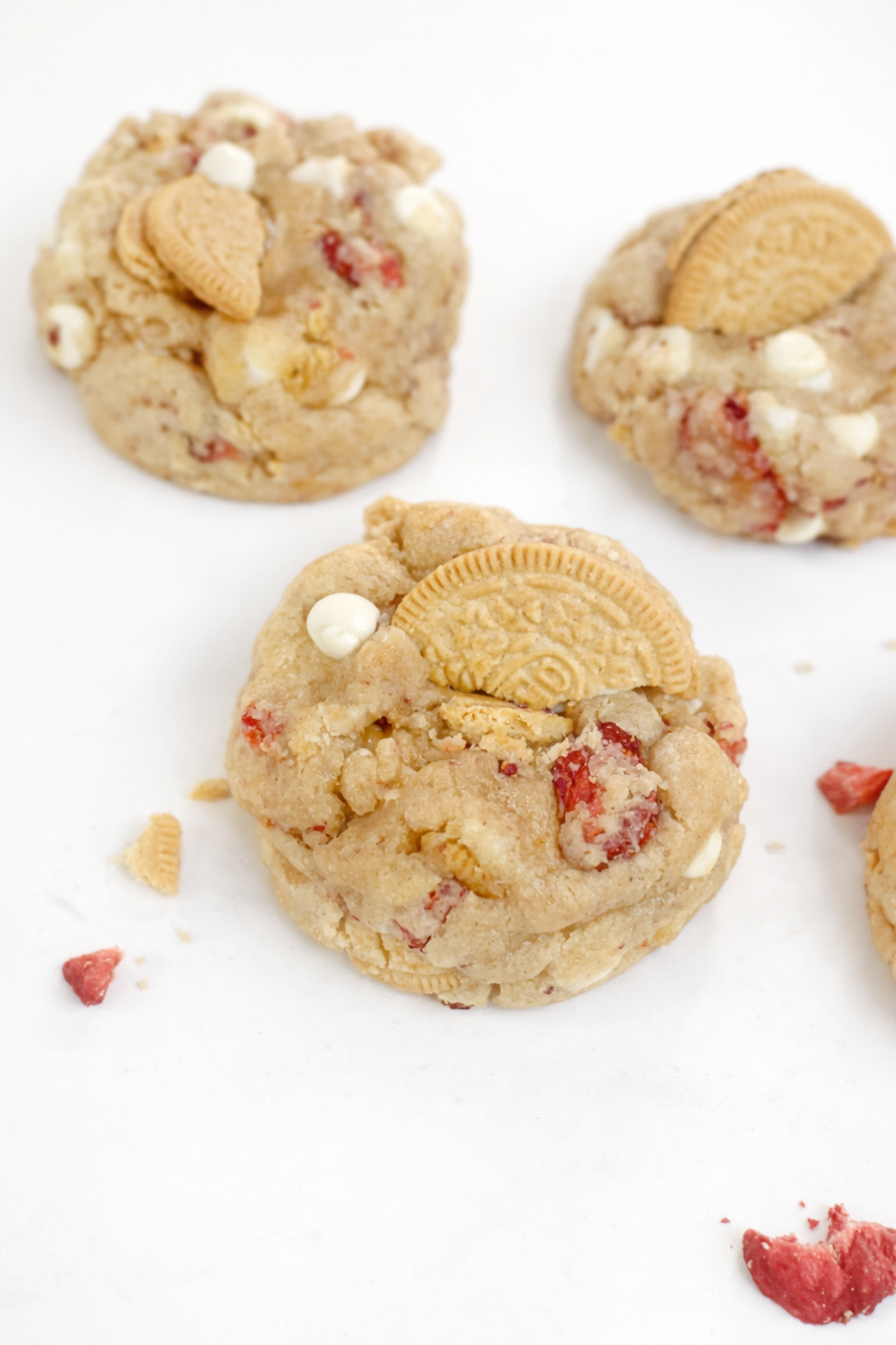 Our playful twist on a classic. This soft cookie is baked with strawberry bits, melty white chocolate, and crunch golden oreo pieces for the perfect shortcake-inspired bite. Sweet, bright, and a little flirty- the Shortie brings sunshine to every box.